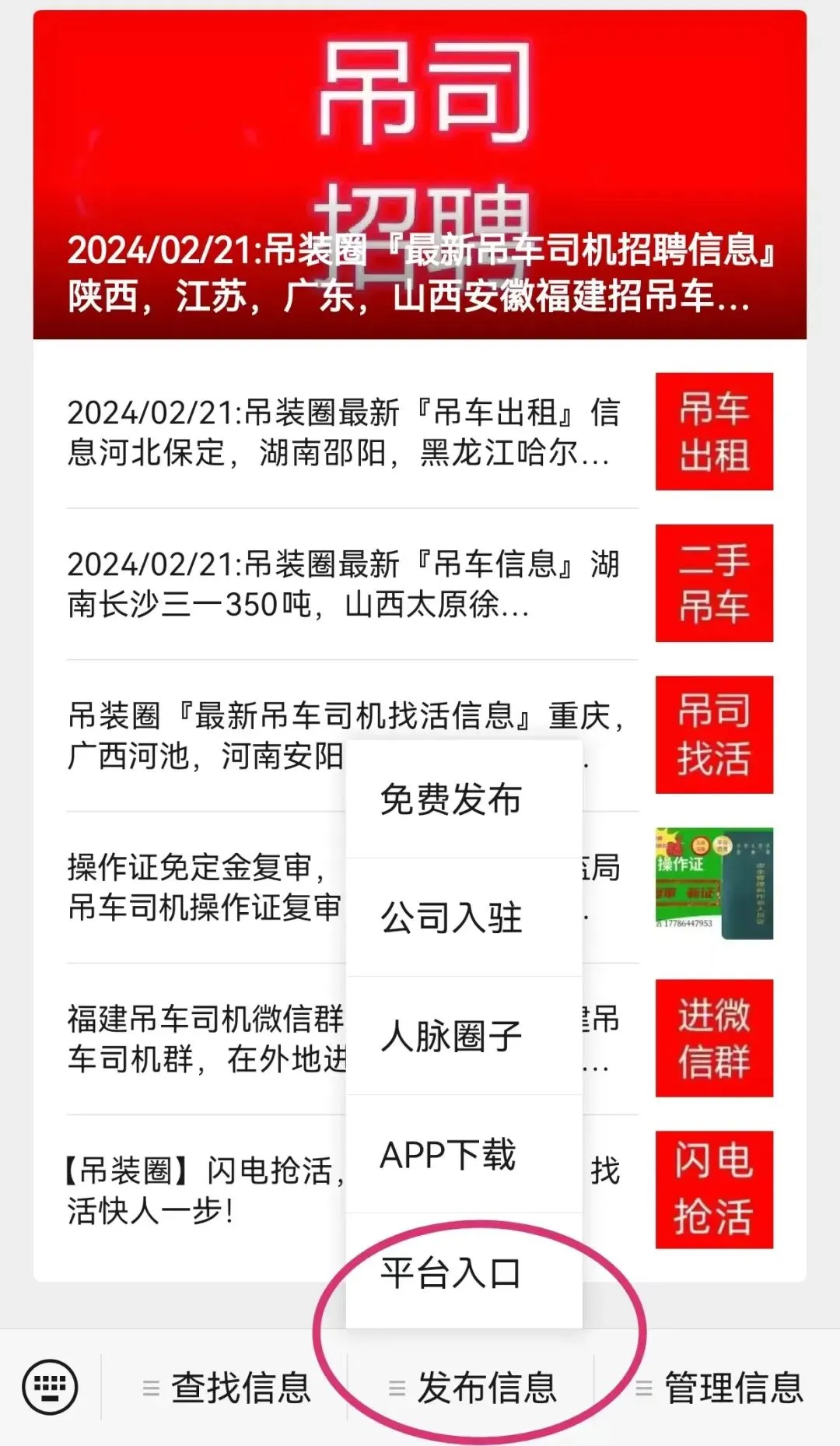▲扫码或长按二维码查看电话如需自己信息在此展示,扫二维码进平台可免费发布:招司机/找工作/找替班/租吊车/二手吊车/找活/找客户/发广告【吊装圈】吊装人自己的信息交流圈春节一过,各位大佬春节快乐,闲置司机找车开,50-80都可以,双证齐全,工资月结,有需要的老板联系,150****4512意向城市 : 江苏省 无锡市