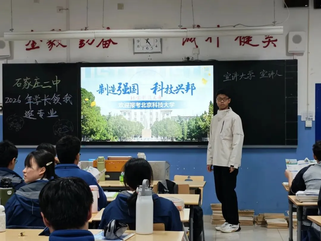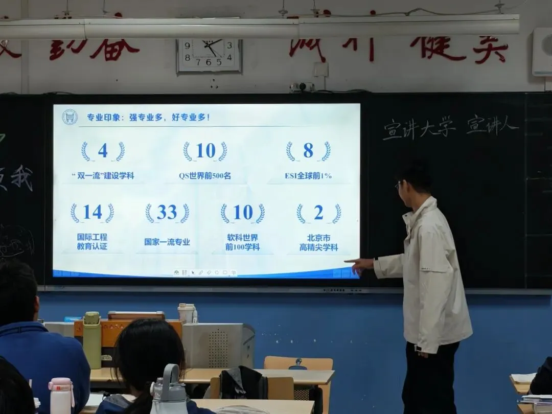 宣讲中,团队成员不仅介绍了学校作为首批“双一流”高校的扎实根基,例如QS内地排名第24位、习近平总书记两次回信勉励等重要荣誉,还展示了北科大在科研领域取得的一系列成果:从我国第一颗人造卫星的外壳材料,到“复兴号”高铁的制动闸片,再到青藏铁路关键难题的攻克以及火星探测任务的参与,处处体现着“科技报国”的底色。与此同时,我们也分享了学校位于首都核心区的优越地理位置、设施完备的宿舍条件以及备受好评的食堂,让同学们在感受学术魅力的同时,也体会到北科大校园生活中温暖而真实的一面。