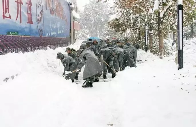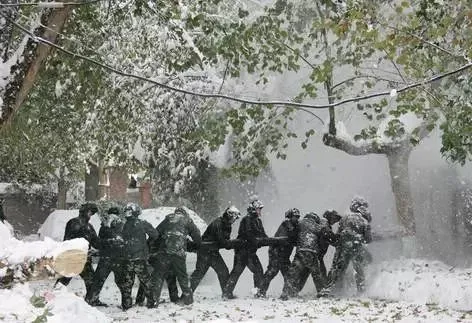 部队官兵采用木棍撞击树上积压的雪,用铁楸铲除积雪,为市民开路。
