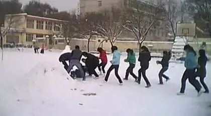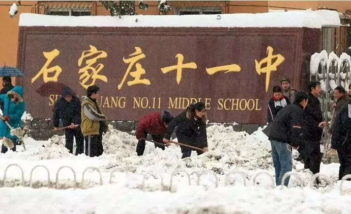 石家庄市第十一中学,学校组织学生清扫校门口的积雪。