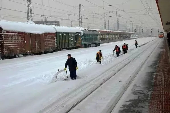 大雪已将铁轨覆盖,火车大面积停运,铁路工作者在清除积雪。