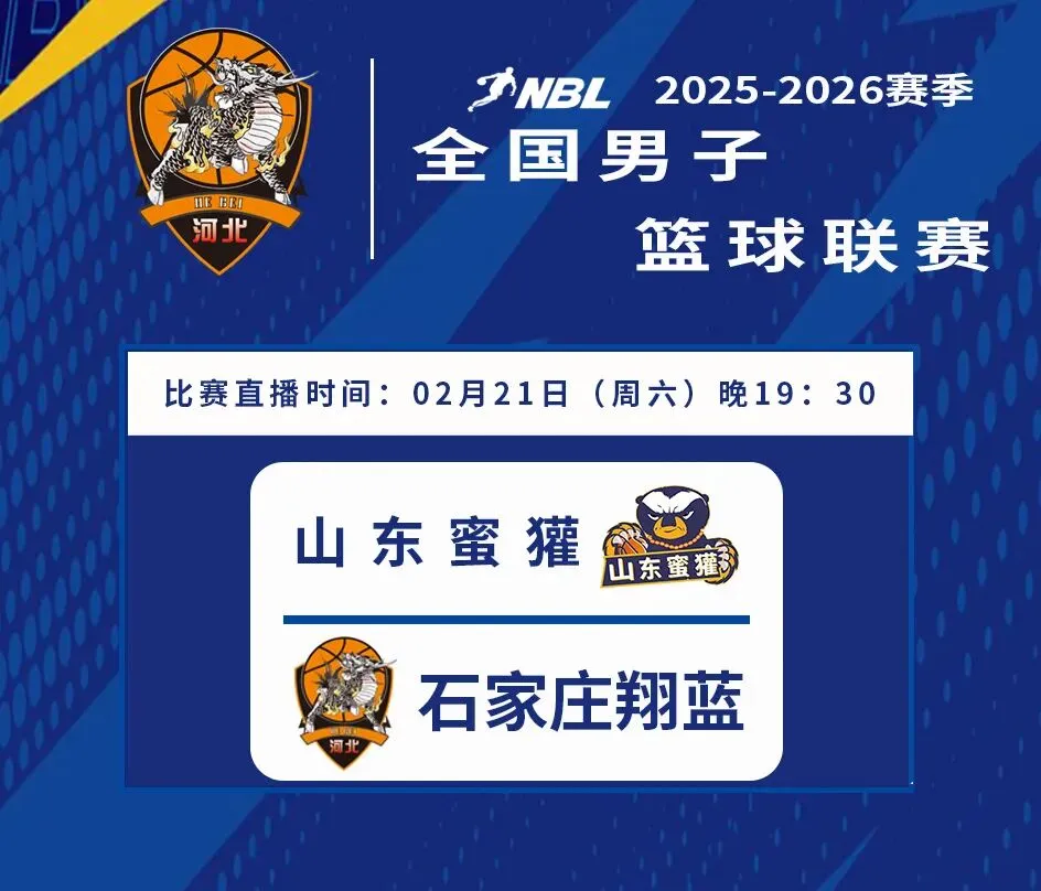 在经历了春节的间歇期后,2025-2026赛季NBL联赛即将重燃战火。2月21日(大年初五),石家庄翔蓝将与山东蜜獾在第十六轮比赛中直接对垒,联手为球迷送上春节大餐。