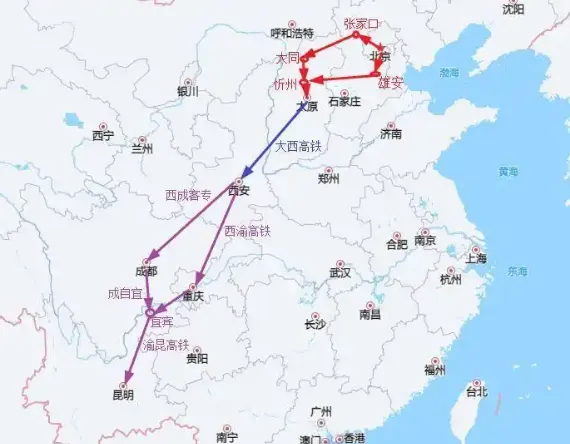 2、北京-雄安-忻州-太原-西安-成都-昆明