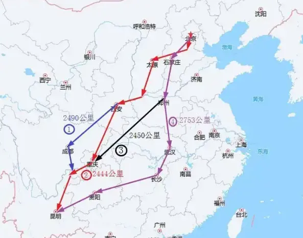 1、北京-石家庄-太原-西安-成都-昆明