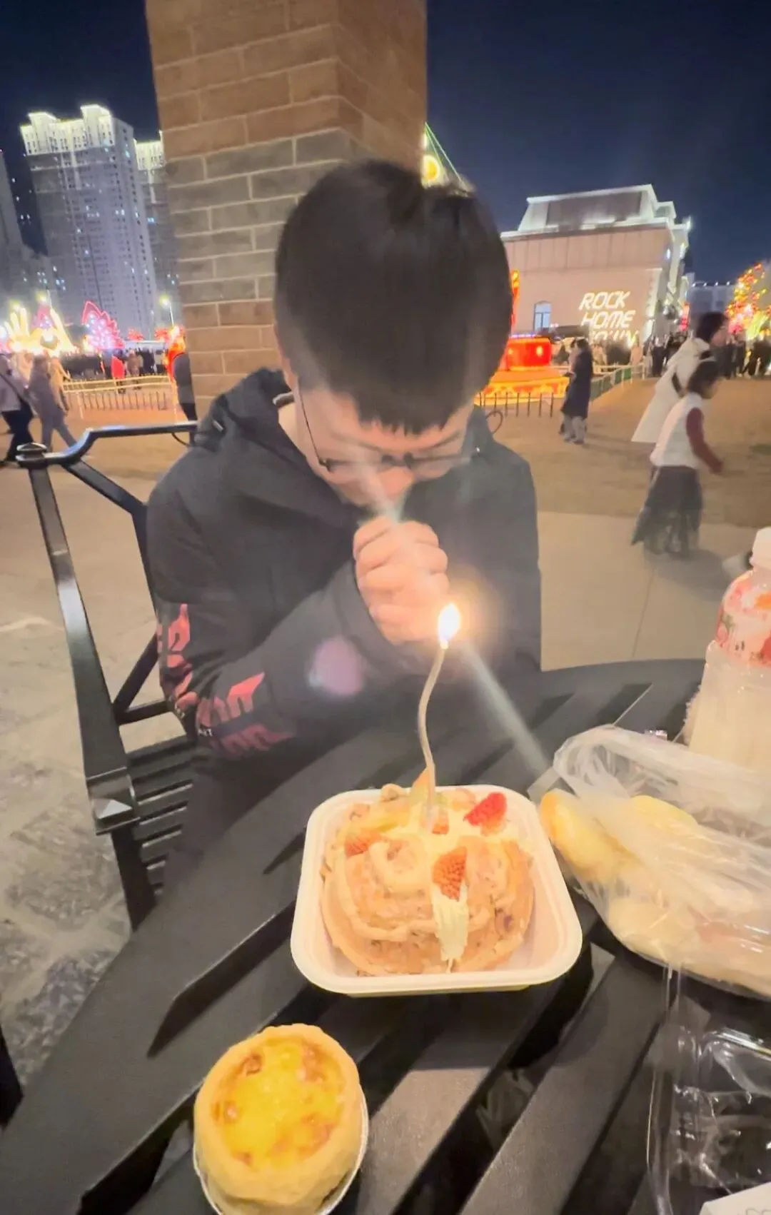 还买了老婆饼和牛舌饼,牛舌饼做的挺好的,它的味道跟稻香村的很像,个头不如稻香村的大。那天晚上特别暖和,走累了,我们坐在正太饭店侧边长廊的桌子旁,向路人借了一个打火机,点燃了蜡烛,给老弟简单补过了一个生日,特别的幸福。之前我对仪式感这件事情有一点抵触,总觉得这是一件耗时耗力的事情。但后来看到有人在网上用鸡蛋当蛋糕,棉签当蜡烛,过生日,就觉得其实仪式感是把自己爱的人放在心里,记得这件事情就行。仪式感不需要花太多的钱,能想到,被人惦记着就是一种幸福。让蜡烛代替所有灯,让音乐代替话语声