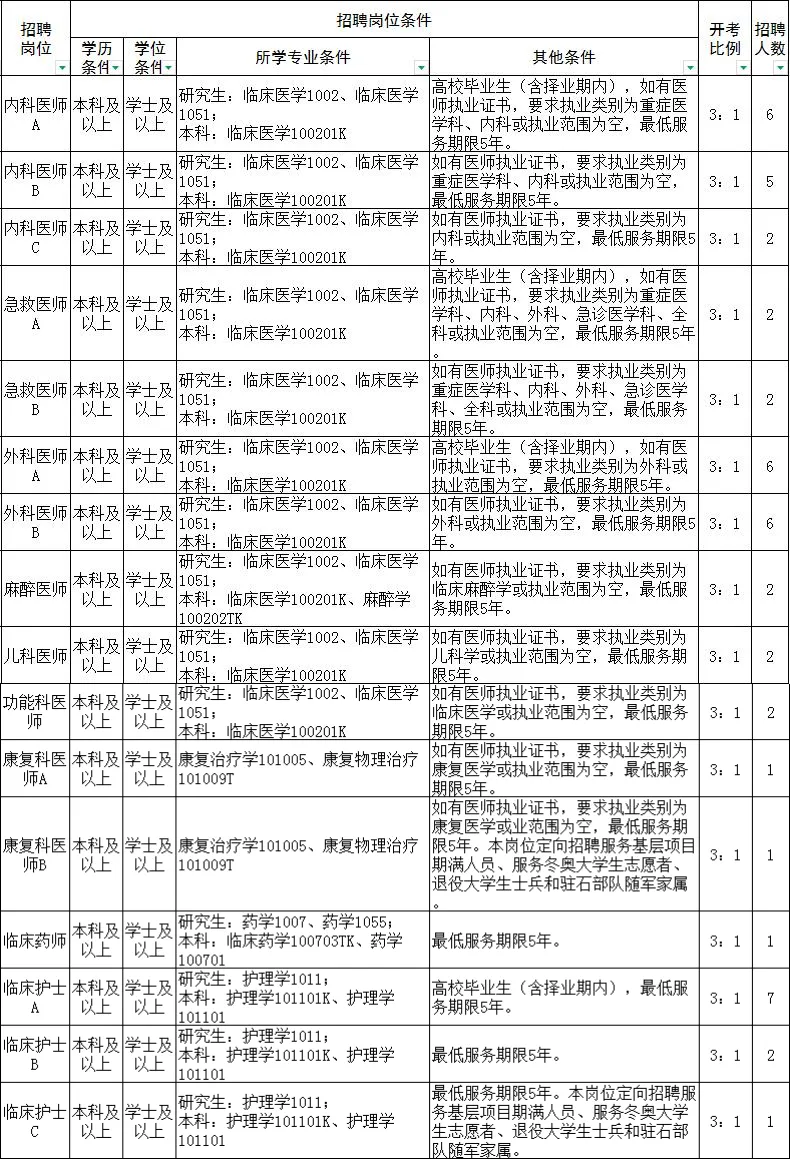根据医院发展需要,现面向社会公开招聘卫生专技工作人员,具体招聘岗位及条件如下: