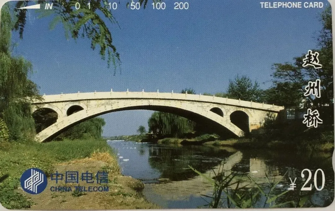 这是1枚1995年9月原中国邮电电信总局发行的电话磁卡,属于《中国名桥——古代石拱桥》,志号 CNT--7系列中的第1枚,志号为CNT-7-(5-1),面值为20元。赵州桥电话磁卡的图案主体,是河北省石家庄市赵县的赵州桥,位于赵县城南河上。赵州桥,又称“安济桥”,位于河北省石家庄市赵县,是世界上现存年代最久远、跨度最大、保存最完整的单孔坦弧敞肩石拱桥。赵州桥建造时间是在隋代大业年间,由著名匠师李春设计并主持建造,距今已有约1400多年历史。赵州桥首创“敞肩拱”结构,即在大拱的两肩上各设两个小拱,既减轻了桥身重量,又增强了泄洪能力,是世界桥梁史上的创举。