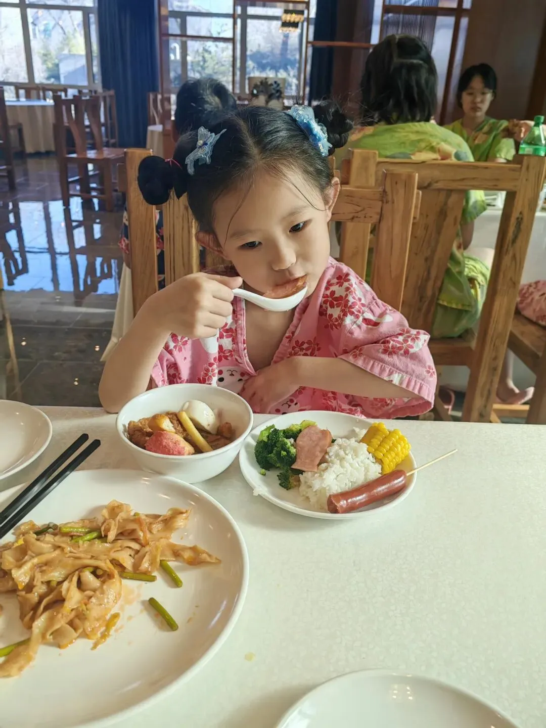 玩到中午,肚子也饿了,我们直接去吃自助餐。菜品丰富,味道也不错,热菜、凉菜、水果、饮品都有,吃饱喝足,刚好补充体力。女儿吃得香香的,我也能安安静静歇一会儿,不用再额外操心吃饭的问题,带娃出行真的方便太多。