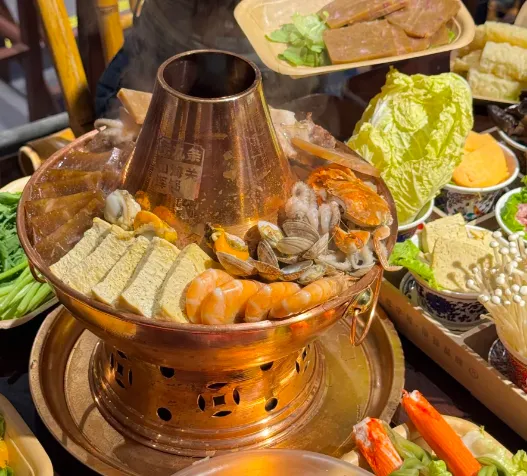 🥢 必尝:山海关浑锅这菜讲究个“杂”与“融”。铜火锅里,酸菜铺底,这是魂。上面一层层码上五花肉片、焖子、丸子、冻豆腐,最关键的是要铺上海米、海带甚至螃蟹。炭火一烧,酸菜解了肉的腻,海鲜提了汤的鲜。汤一滚,香气就钻鼻子,咬一口吸满汤汁的冻豆腐,烫得直吸气,但就是舍不得吐出来。