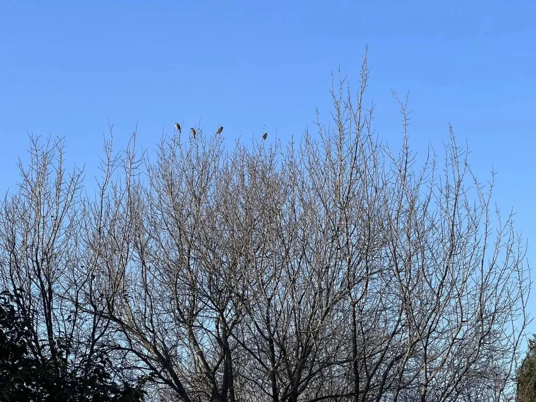 树梢上几只小鸟,我坐在石凳子上晒着太阳,欣赏它们树上驻足