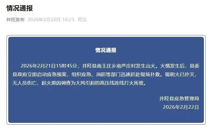 据井陉县应急管理局通报:2月21日15时45分,南芦庄村的火情发生后,县委县政府立即启动应急预案,组织应急、消防等部门迅速赶赴现场扑救。现明火已扑灭,无人员伤亡。经调查,起火原因为大风引起的高压线连线打火所致。