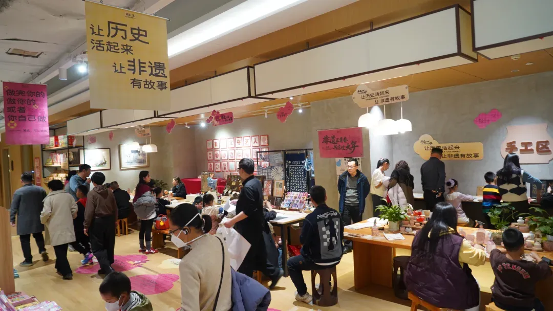 沧州市新华书店精心设置蛋雕、缠花绒花、剪纸、绳编、年画、陶艺等非遗体验项目,读者可近距离观摩、亲手实践。