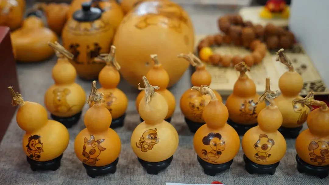 葫芦烙画摊位前整齐摆放着各式烙画葫芦:有的烙着“财源广进”“鸿运当头”等吉祥词语,有的烙着龙、马等生肖图案,最惹人注目的是一个用八个葫芦的不同部分拼接而成的小茶壶,独具匠心。