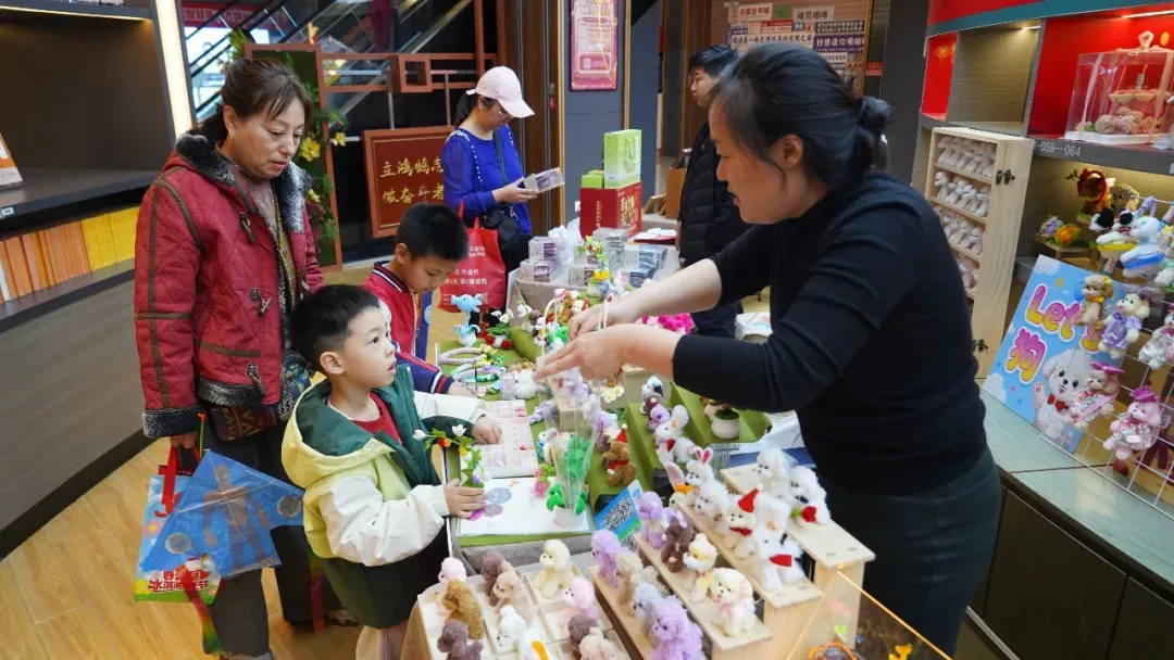 58岁的魏女士循着宣传而来,糖画摊位前精巧的作品吸引了她的目光;上幼儿园的小段在手工玩偶摊位前拉着姥姥的手不肯走,原来他想给妈妈挑一份生日礼物,最终小段选了妈妈喜欢的花卉玩偶。