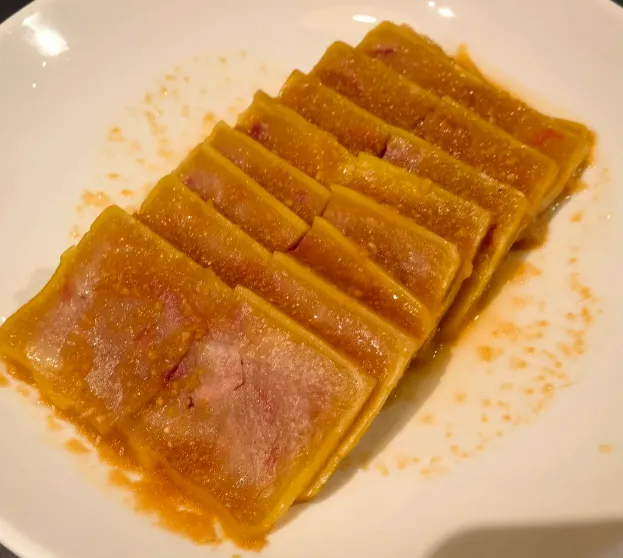这菜讲究个“趁热”。选肥瘦相间的肉,剁碎了加粉芡,不是炸,而是蒸熟后趁热切片。淋上特制的醋蒜汁,咬一口,肉香裹着蒜香,软糯不腻,一口下去,心都踏实了。