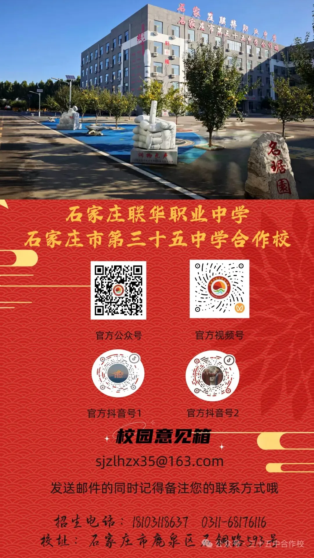 石家庄联华职业中学是经石家庄市教育局批准设立的全日制职业高中,学校坐落于鹿泉区石铜路593号,占地86亩,建筑面积3.7万余平方米,配备31个专业画室、智慧黑板教室、图书馆、室内外运动场等完善设施,环境优美舒适。学校专注升学型人才培养,近年来,教学成绩持续攀升,现有在校生2000余人,教职工170余名,形成了结构合理、理念先进的教学团队。