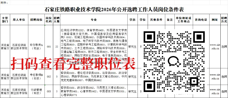 具体要求详见《石家庄铁路职业技术学院2026年公开选聘工作人员岗位条件表》(附件)。其中专业参考教育部《授予博士、硕士学位和培养研究生的学科、专业目录》《普通高等学校本科专业目录》《普通高等学校高职高专专业参考目录(试行)》等设置。