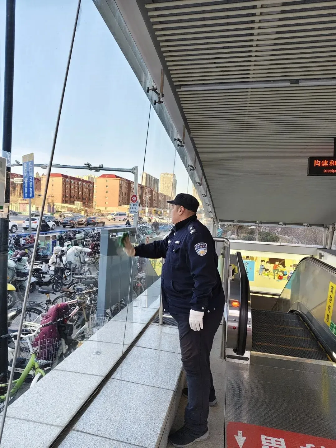 在塔北路区域,志愿者刘意进行了禁炮巡逻,并对沿线公交站牌的玻璃和扶手进行了擦拭清洁。