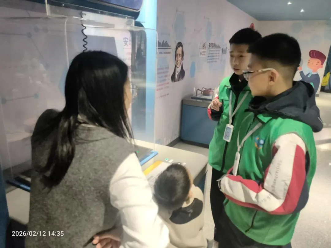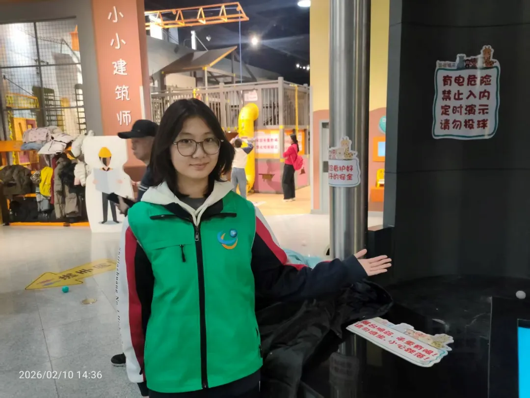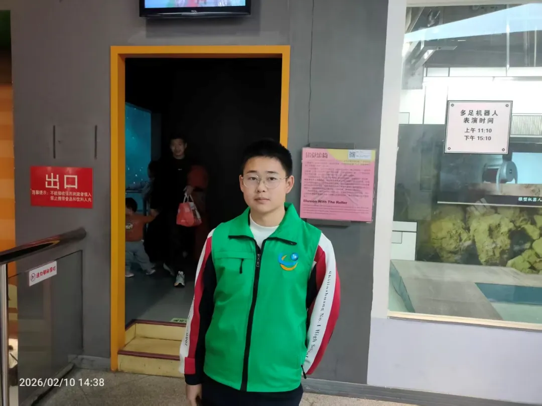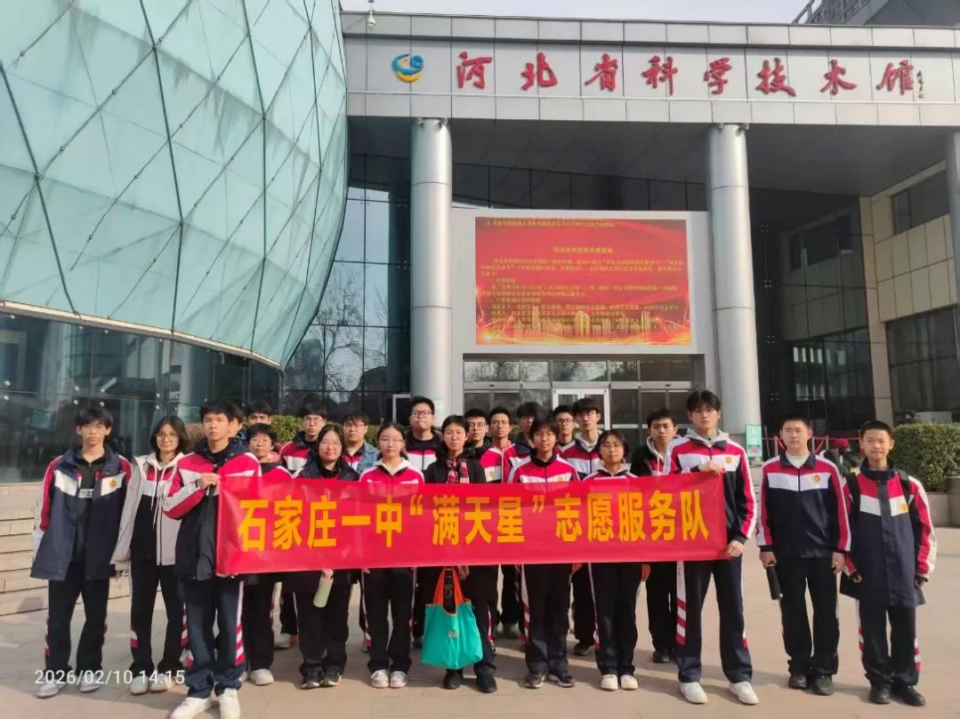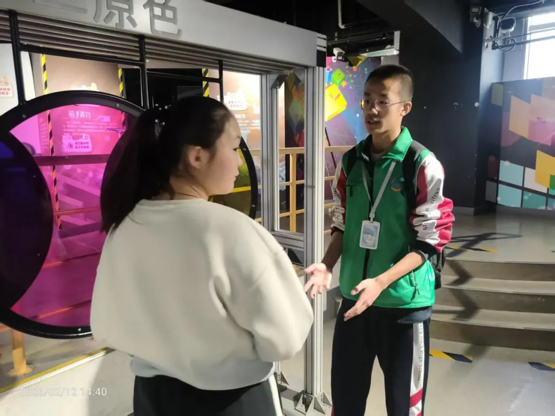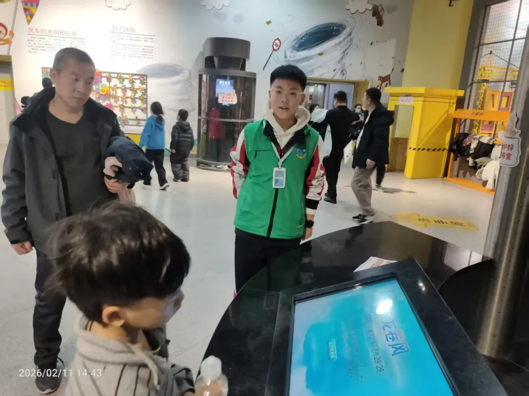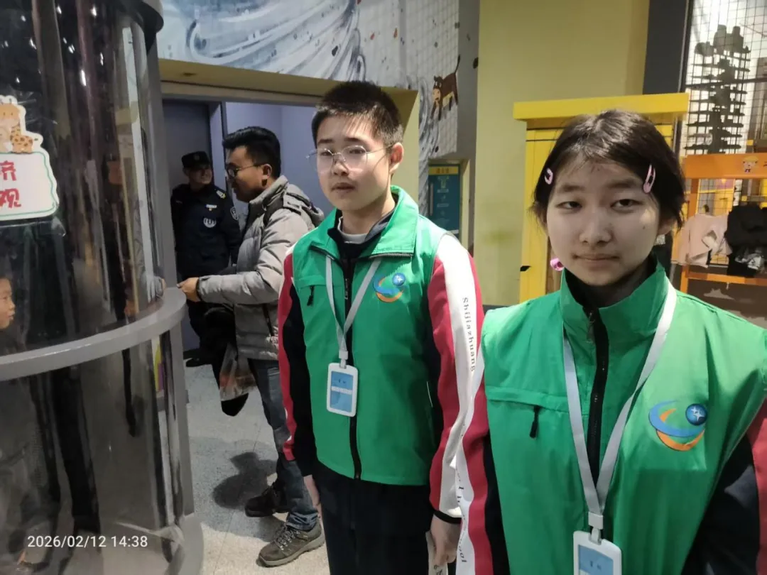 这个寒假,石家庄一中满天星志愿服务队的校园绿,与河北省科技馆的科普红,交织成一道亮丽的风景线。在学生科学院院长韩金山的组织带领下,一群朝气蓬勃的学子走出校园,走进河北省科技馆,用热情的服务和专业的讲解,为公众带来温暖,也为自己的寒假生活增添了浓墨重彩的一笔。此次志愿服务活动持续三天,覆盖科技馆多个核心展区,服务游客几千人次,成为寒假期间科技馆内最活跃、最温暖的一股青春力量。志愿者们身着统一的绿色马甲,穿梭于各个展厅之间,如同点点星光洒落科学殿堂,用青春的脚步丈量责任,用真诚的微笑传递知识。