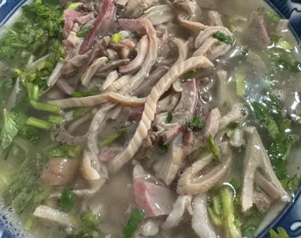 【平泉羊汤做法简述】这道菜讲究的是功夫。选新鲜的羊骨和羊杂,反复清洗直到水清无色。大锅冷水下骨头,大火煮沸后转文火慢炖,这一炖就是几个小时,直到汤色熬成浓郁的奶白色。吃的时候,把切好的羊杂在滚汤里一烫,盛入碗中,撒上一大把葱花香菜,再淋上一勺红亮亮的辣椒油。汤一喝,人就醒了。
