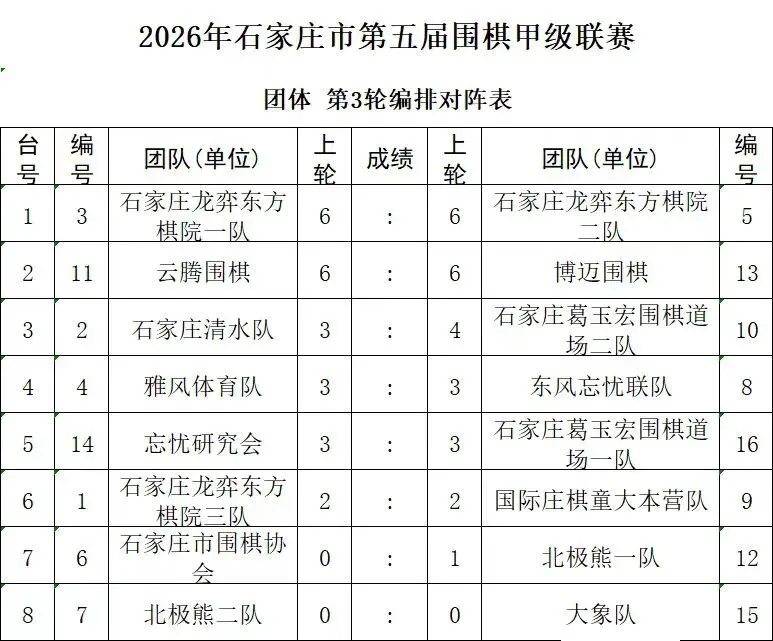 >2026年石家庄市第五届围棋甲级联赛第2-4轮对阵表