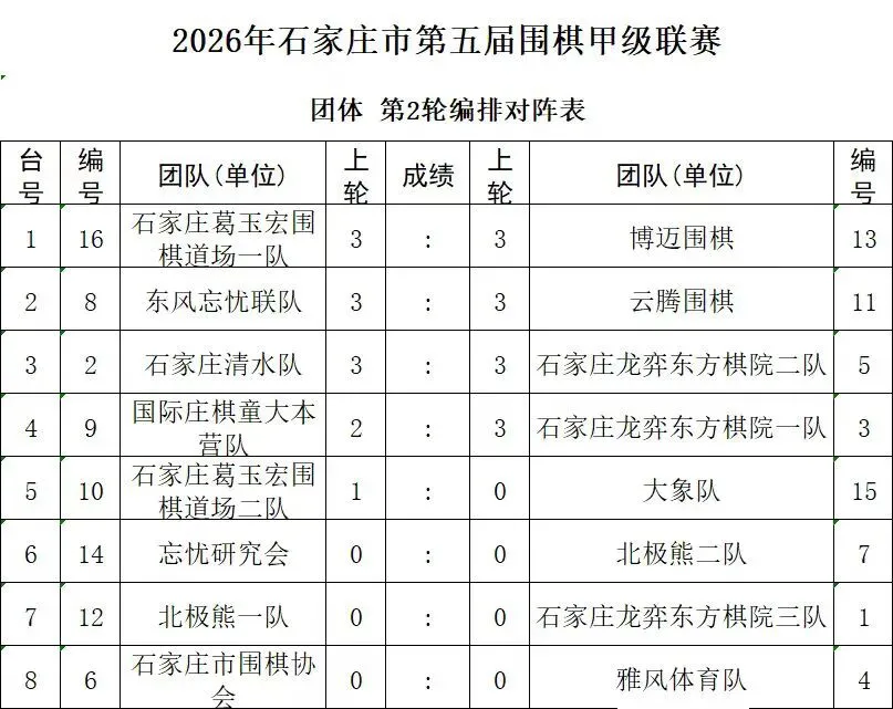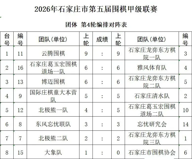>2026年石家庄市第五届围棋甲级联赛第2-4轮对阵表