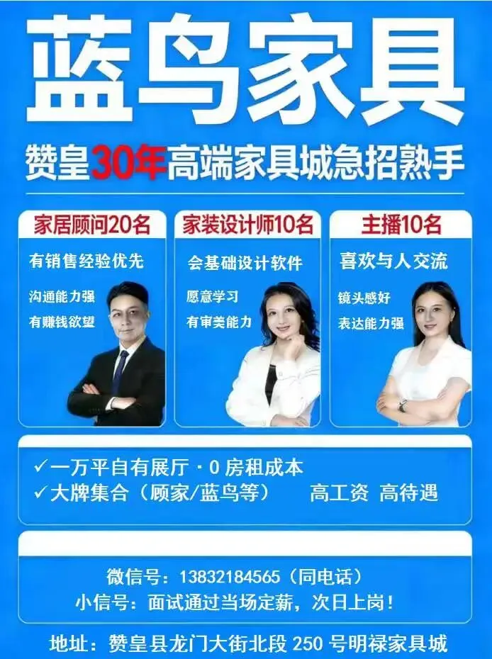 蓝鸟家具·明禄家具城 高薪诚聘:家居顾问20名家装设计师10名主播10名待遇优越,当场定薪,欢迎报名!📍 工作地点:赞皇县龙门大街北段250号明禄家具城📞 有意者微信或电话联系13832184565(同微信)固定电话:84226777