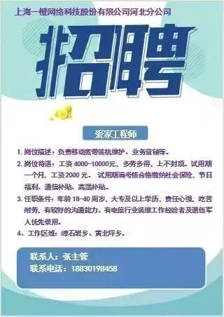 招聘移动装维人员(智家庭工程师)要求:1、男,25岁以上,45周岁以下,高中以上学历,良好的沟通能力,2、有市场拓展经验者优先3、工作内容:包片管理,负责本区域内移动宽带、电视业务的拓展、安装、维护及其他业务的发展4、薪酬待遇:试用期一个月,期满签订正式劳动合同,工资实行底薪+提成,目前人均工资4000+优势:集中培训、统一管理、上班时间灵活,工作地点: 嶂石岩乡 院头镇咨询电话:18830198458