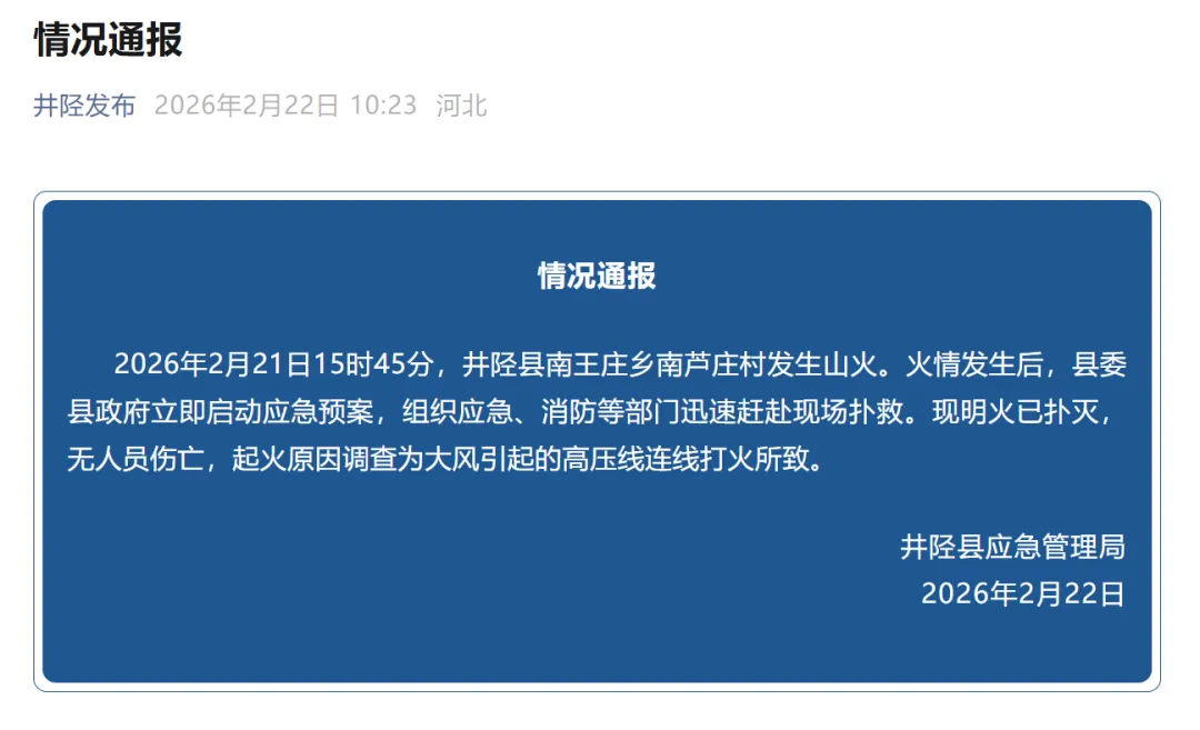据新华社消息,河北省石家庄市井陉县应急管理局22日发布情况通报称:2月21日15时45分,井陉县南王庄乡南芦庄村发生山火。火情发生后,县委、县政府立即启动应急预案,组织应急、消防等部门迅速赶赴现场扑救。目前明火已扑灭,无人员伤亡,起火原因为大风引起的高压线连线打火。