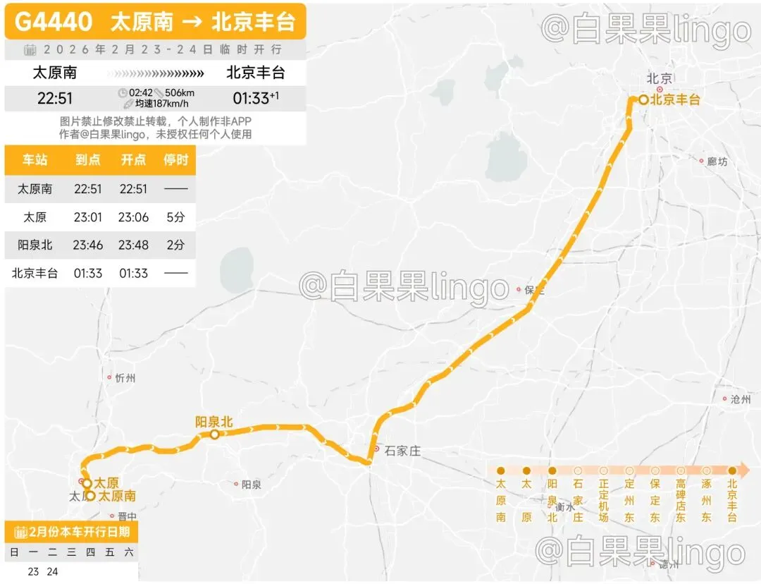 G4440次临时加开列车始发太原南站,终到北京丰台站,作为加开的太原夜间返京工作专开列车,太原南站出发22:51,在晚上十一点停靠太原市中心的太原火车站,随后停靠阳泉北站后一站直达终点站北京丰台站。本车只在2月23日和2月24日开行两天。