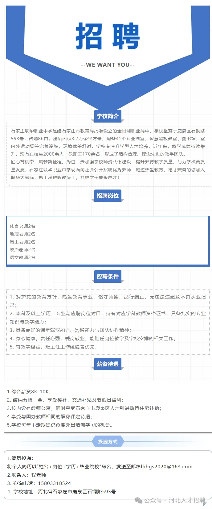 有高中教学经验,教学成绩优秀,担任过班主任优先录用。