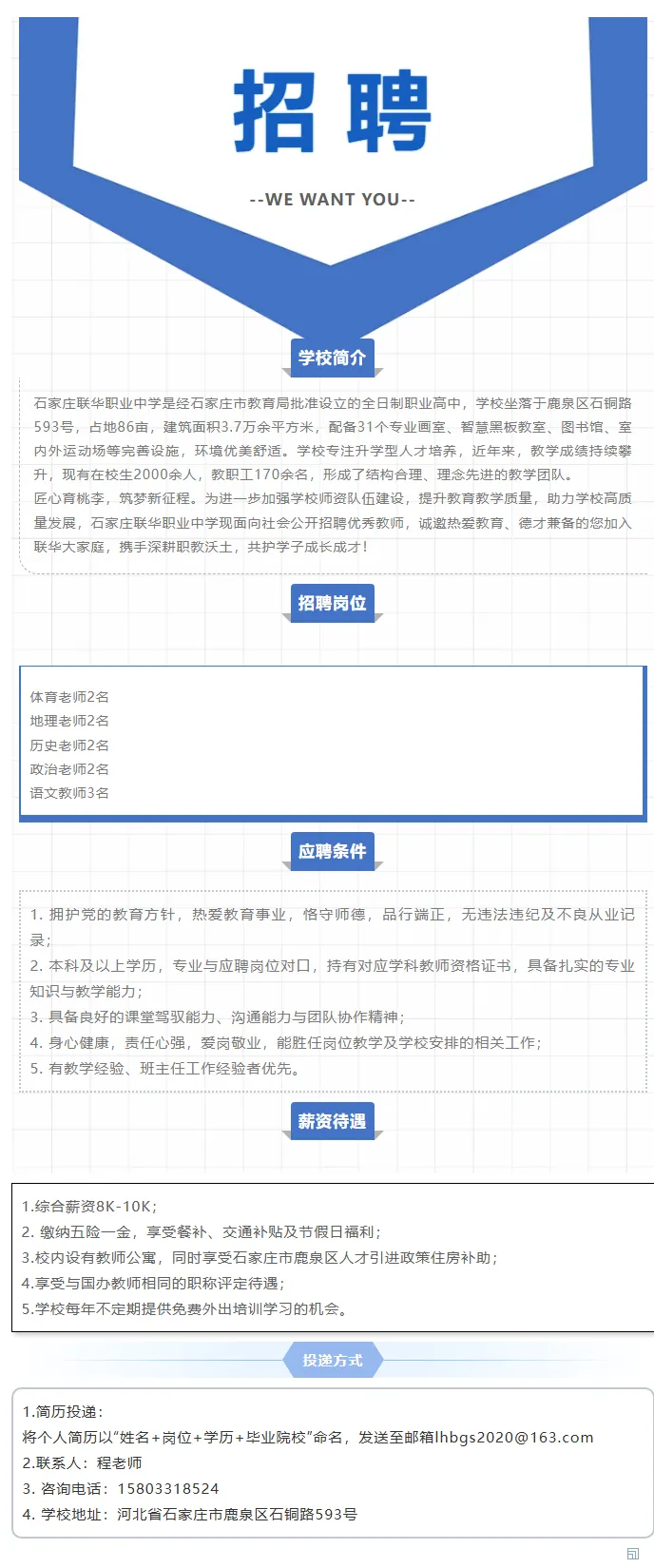有高中教学经验,教学成绩优秀,担任过班主任优先录用。