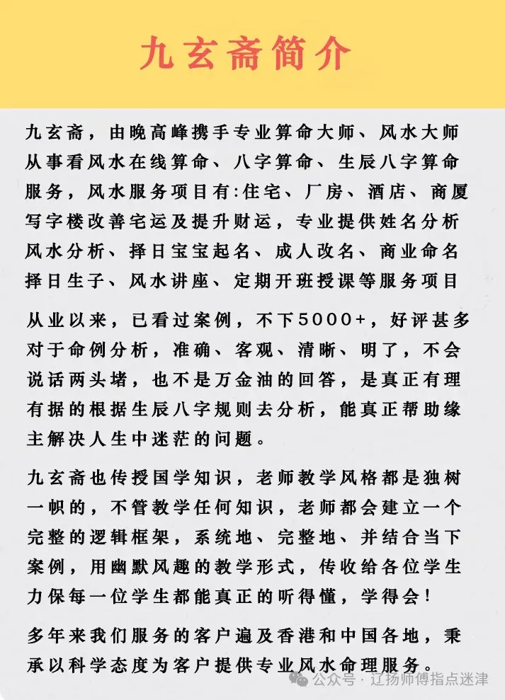 张辽(辽扬先生)专业从事看风水在线算命、八字算命、生辰八字算命服务,风水服务项目有:住宅、厂房、酒店、商厦、写字楼改善宅运及提升财运,专业提供姓名分析、风水分析、择日宝宝起名、成人改名、商业命名、择日生子、风水讲座、定期开班授课等服务项目。