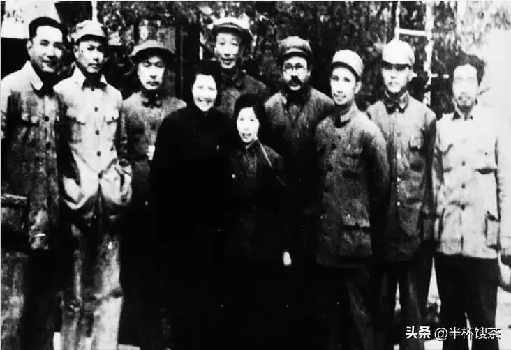 从右至左依次是毛铎、杨立三、粟裕、任弼时、陈琮英、柯庆施、刘昂、陈毅、李先念、金茂岳