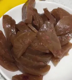这菜看着粗,吃着细。红薯粉条煮软,拌上肉末、蛋液和特制的五香调料,蒸熟后切成厚片。吃的时候得在平底锅里煎一下,煎到两面金黄焦脆。咬开外皮“咔嚓”一声,里面却是软糯咸香的,蘸点蒜醋汁,解腻又提神,一口接一口停不下来。