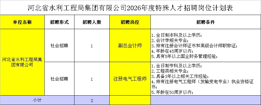 河北省水利工程局集团有限公司2026年度特殊人才招聘公告发布,本次共招聘工作人员2名,网上报名时间:2026年2月15日9:00—2月28日17:00从此次发布《河北省水利工程局集团有限公司2026年度特殊人才公开招聘岗位信息表》中看到本次招聘为社会招聘,小编为大家了整理了职位表!