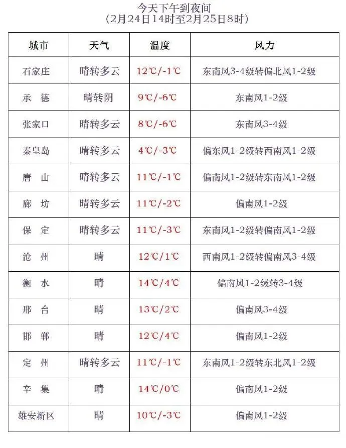 今天下午到夜间,石家庄西北部和保定、廊坊及以北地区晴转多云,其中承德北部多云间阴有零星小雪,其他地区晴间多云。最高气温,张家口北部、承德北部1~5℃,其他地区6~15℃。最低气温,张家口北部、承德北部-17~-10℃,其他地区-9~3℃。