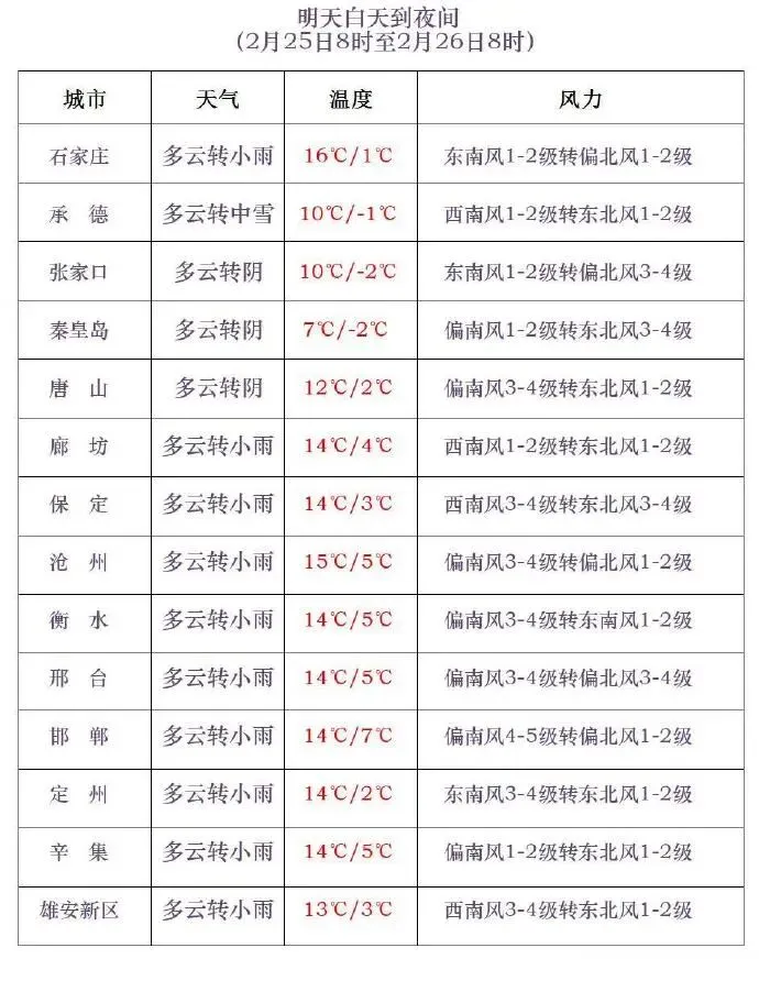 明天夜间到26日,保定中东部、雄安新区、廊坊、唐山南部、秦皇岛南部和石家庄、沧州及以南地区多云转阴有小雨,张家口中北部、承德中北部多云,其他地区多云转阴有小雪或雨夹雪,局地有中到大雪。