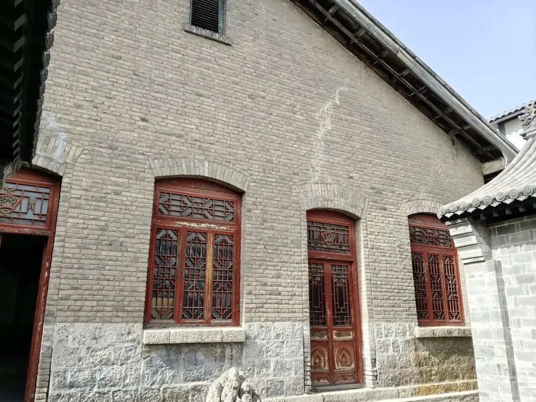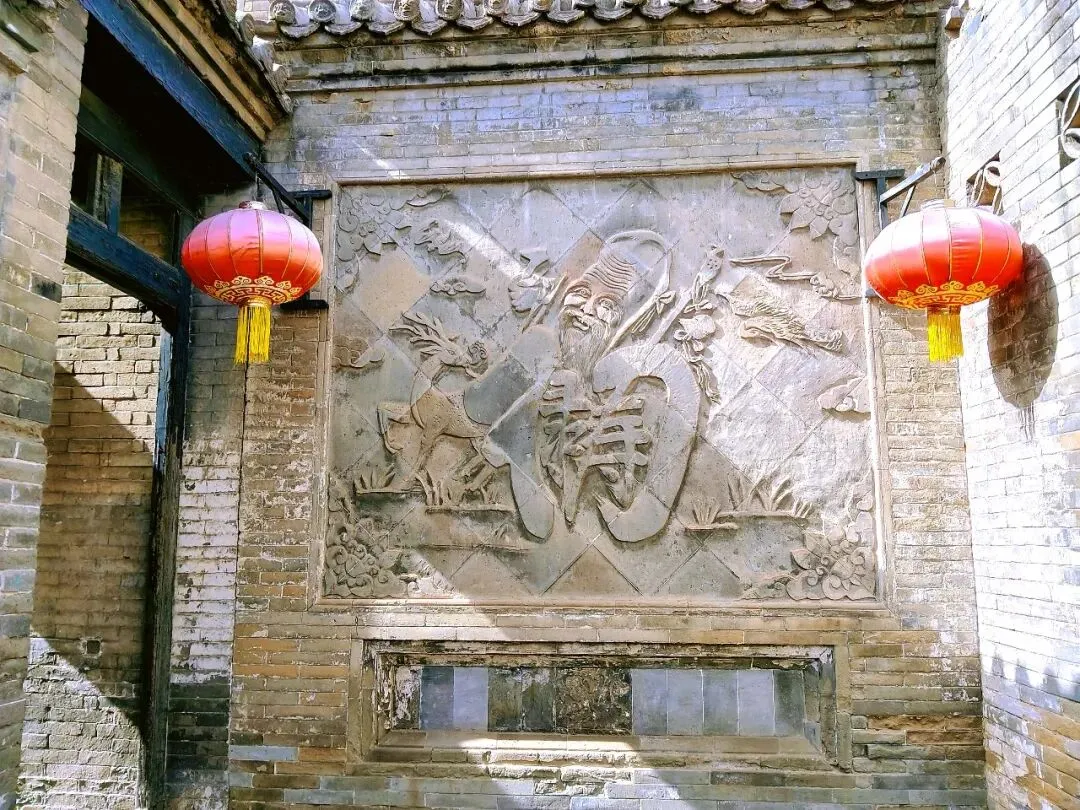 “寿” 字砖雕影壁,正中是一个巨大的 “寿” 字,字体苍劲有力,内部巧妙地融入了一位长须老者的形象,寓意 “寿翁”,周围雕刻有鹿、鹤、蝙蝠、寿桃、祥云等吉祥图案。