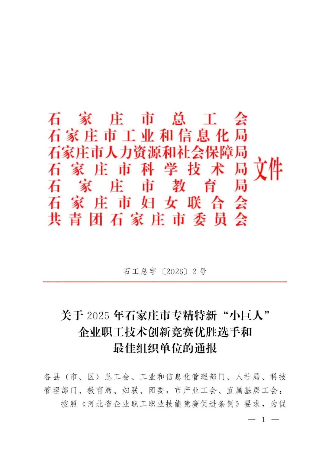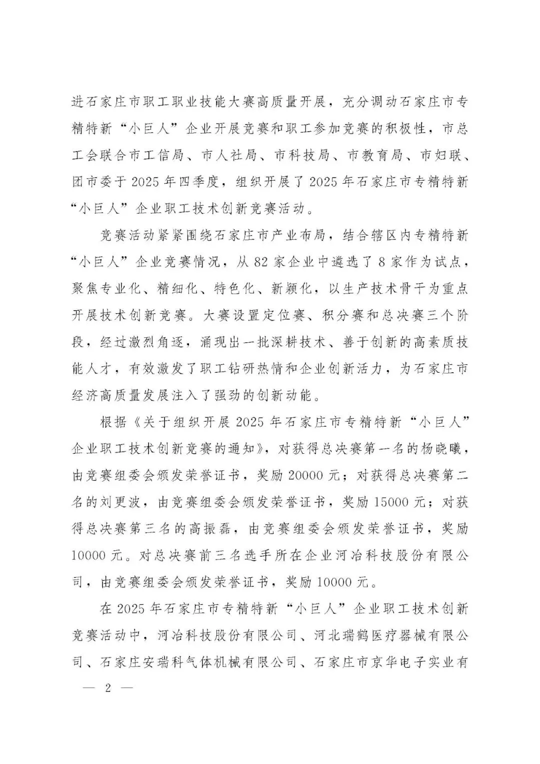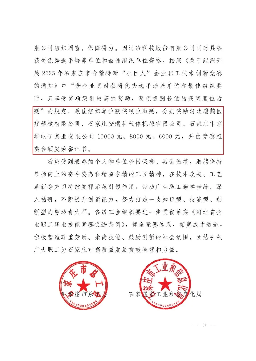 近日,《关于2025年石家庄市专精特新“小巨人”企业职工技术创新竞赛优胜选手和最佳组织单位的通报》正式发布。石家庄市京华电子实业有限公司凭借积极组织、广泛参与、扎实推进职工技术创新工作,荣获最佳组织单位。