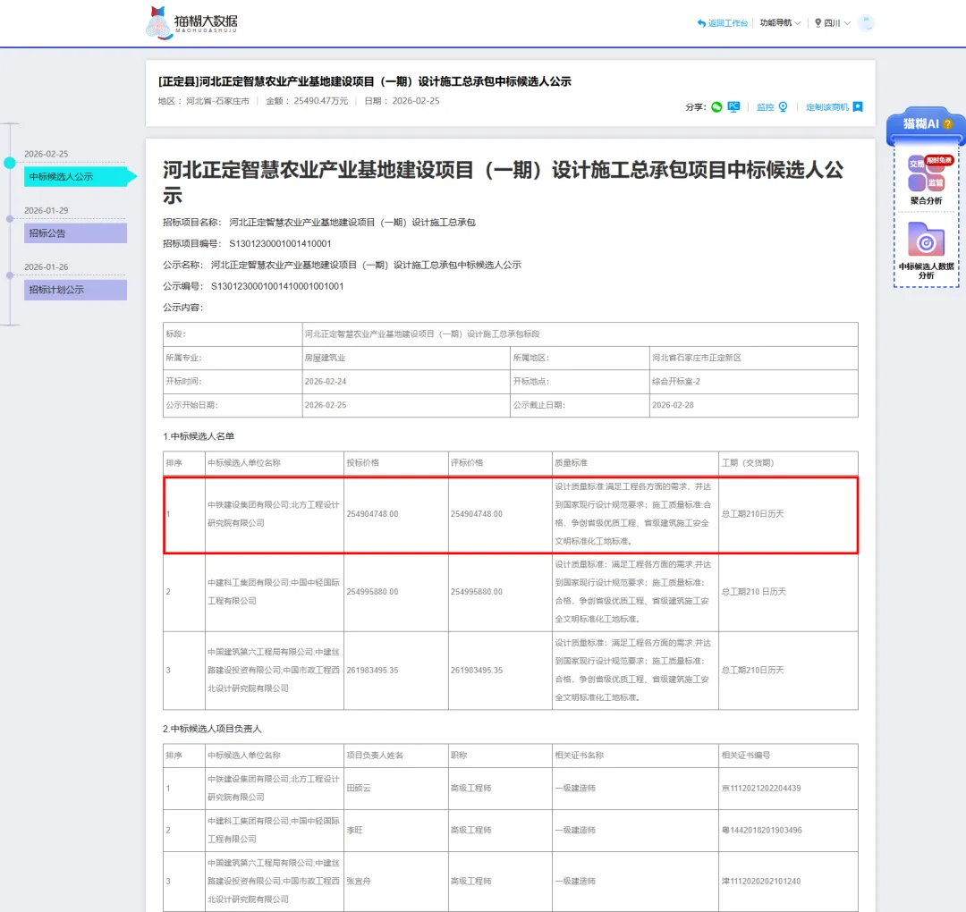 该项目于2月24日正式开标,共有14家单位参与投标,投标最高限价为2.6278亿元。最终由中铁建设集团有限公司、北方工程设计研究院有限公司组成的联合体以2.549亿元成功中标。项目计划工期为210日历天,其中设计期限为合同签订后20日内提供设计任务内全部设计文件,60日内完成施工预算编制,120日内签订预算定案及补充协议;施工计划工期为190日历天。