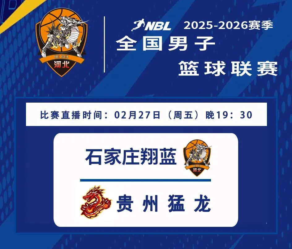 2月27日,在NBL联赛常规赛第十八轮比赛中,石家庄翔蓝将继续主场作战,迎战贵州猛龙。