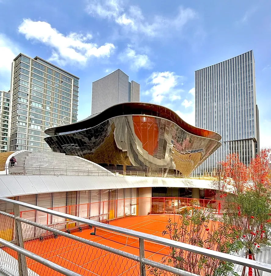 项目由MAD建筑事务所创始人马岩松及其团队设计。该块地原本有个老大难,即能源中心的冷却塔占了近5200立方米的空间,然而,建筑师没按套路出牌,将冷却塔抬升至二层,采用半透明、高反射的ETFE膜材进行包裹,巧妙将原本碍眼的工业设备,变成了一朵飘在树冠上的“云”。