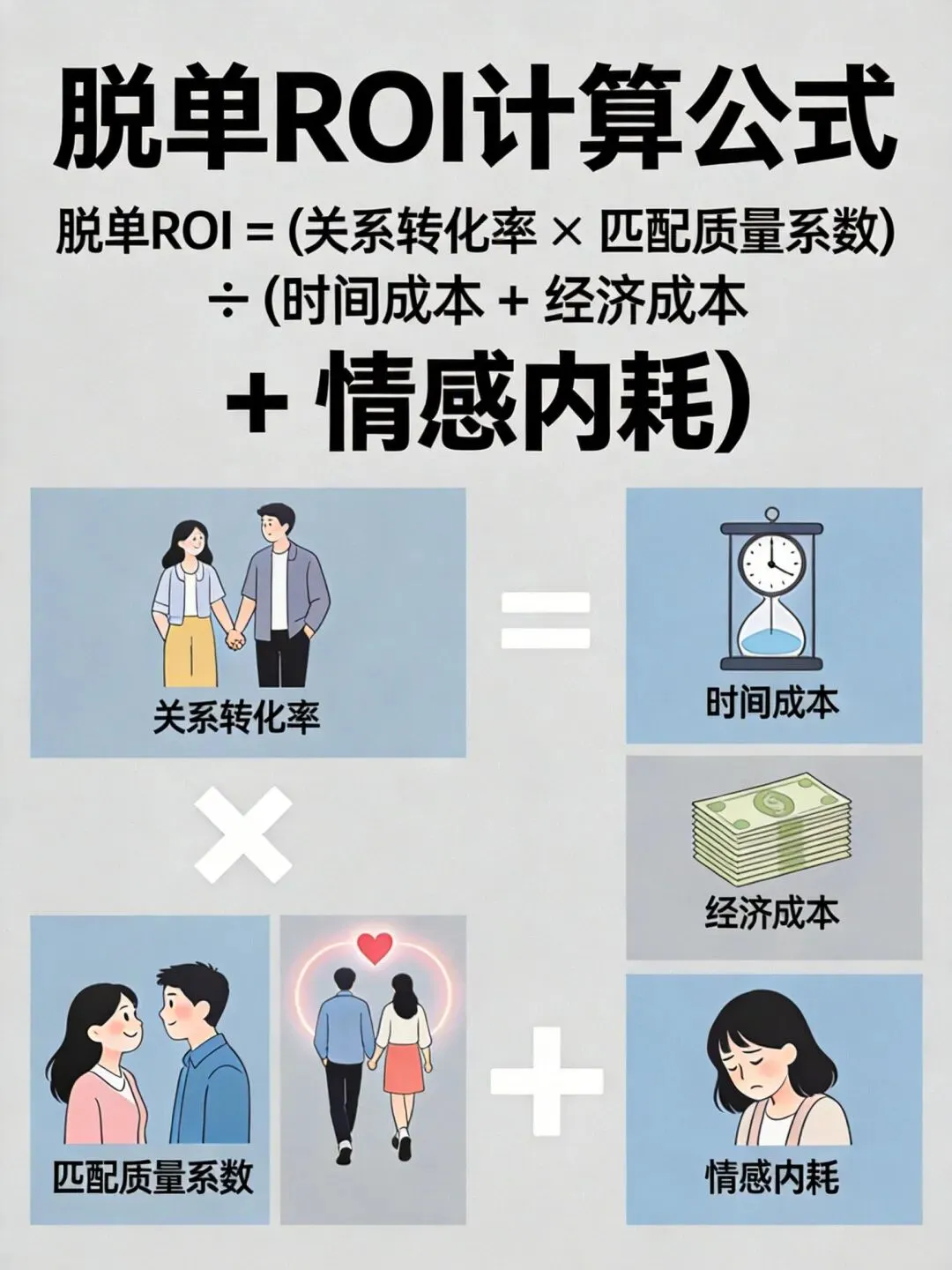 脱单ROI = (关系转化率 × 匹配质量系数) ÷ (时间成本 + 经济成本 + 情感内耗)