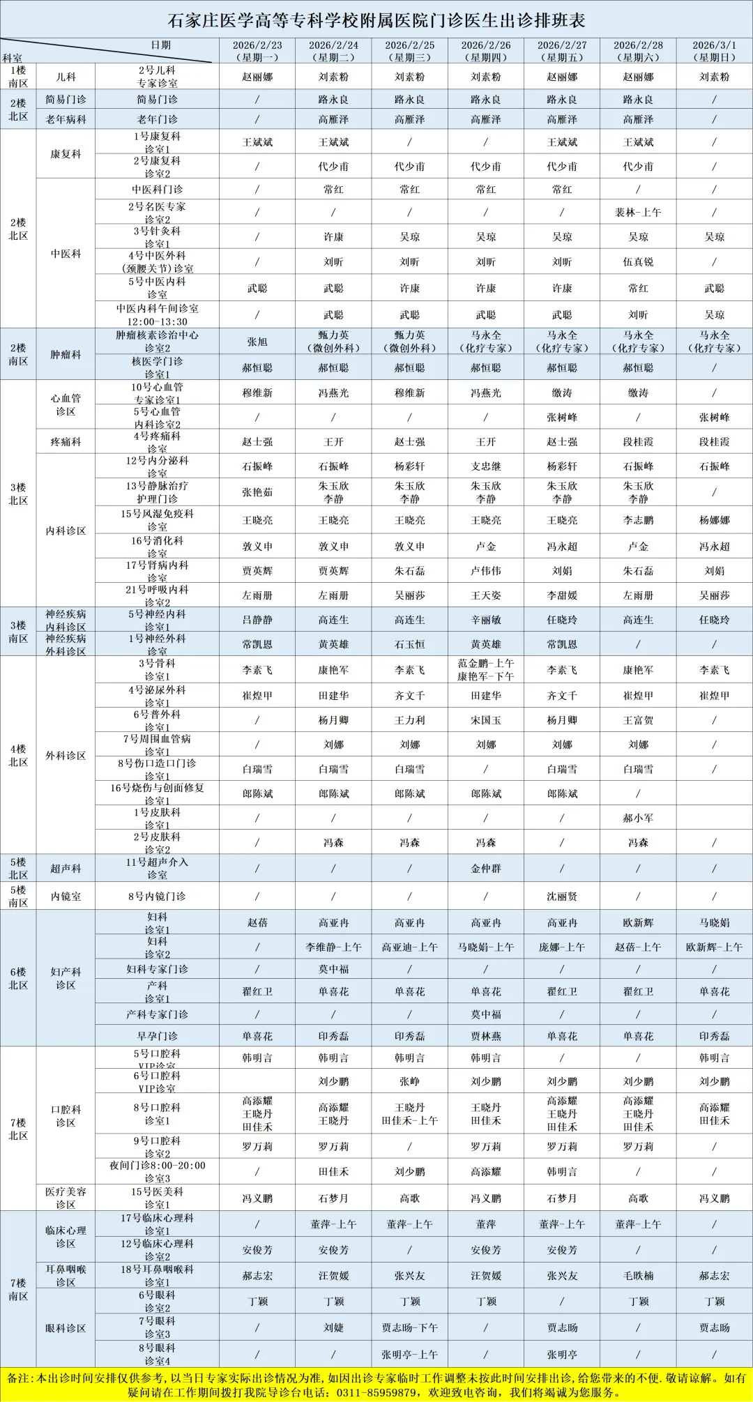 医院开设预防保健科、内科、外科、妇产科、儿科、眼科、耳鼻喉科、口腔科、皮肤科、医疗美容科、肿瘤科、急诊科、重症医学科、康复科、麻醉科、医学检验科、病理科、医学影像科、中医科等50余个一、二级临床、医技科室,能够完成疑难、危重患者的多学科综合治疗。