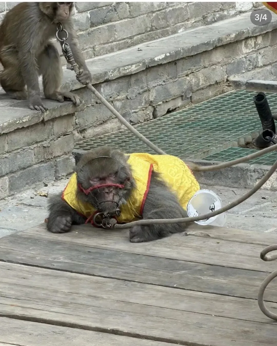 网友发布的图片显示,一只身穿黄马褂的猴子跪在地上,头上罩着黑布,双手被反绑在一根塑料棍上。另有图片显示,一只猴子嘴部套着金属套,脖子上还拴着一根长长的绳子,现场有不少观众围观。不少网友表示,表演画面令人不适,涉嫌虐待动物。