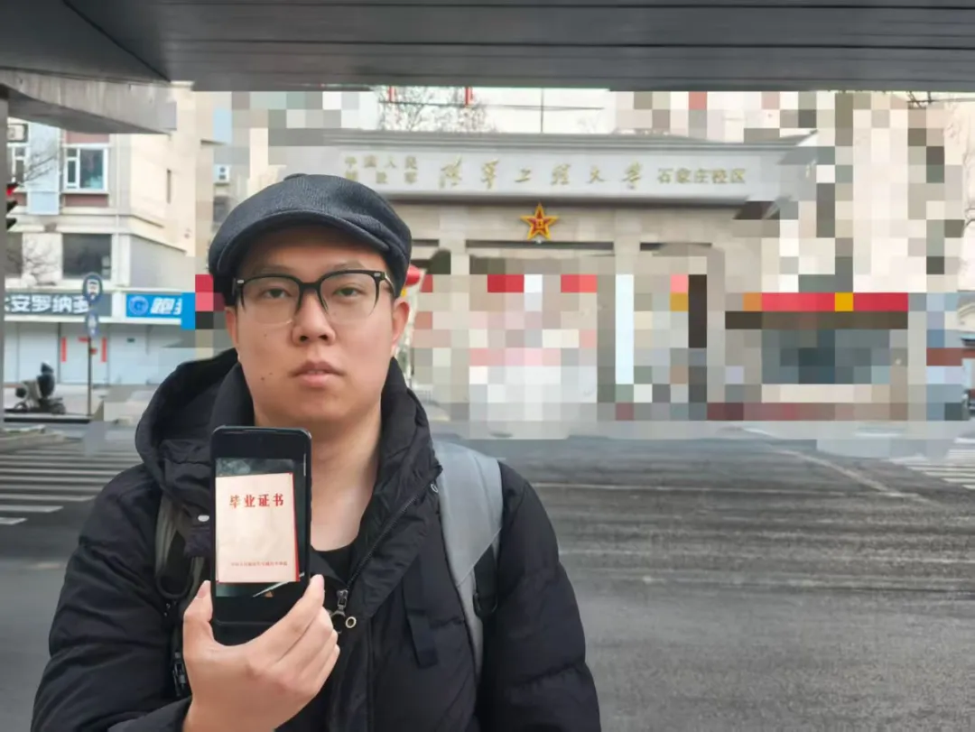 我拿着爸爸的毕业证照片在他的大学门口,拍摄于2026年2月21日07:31
