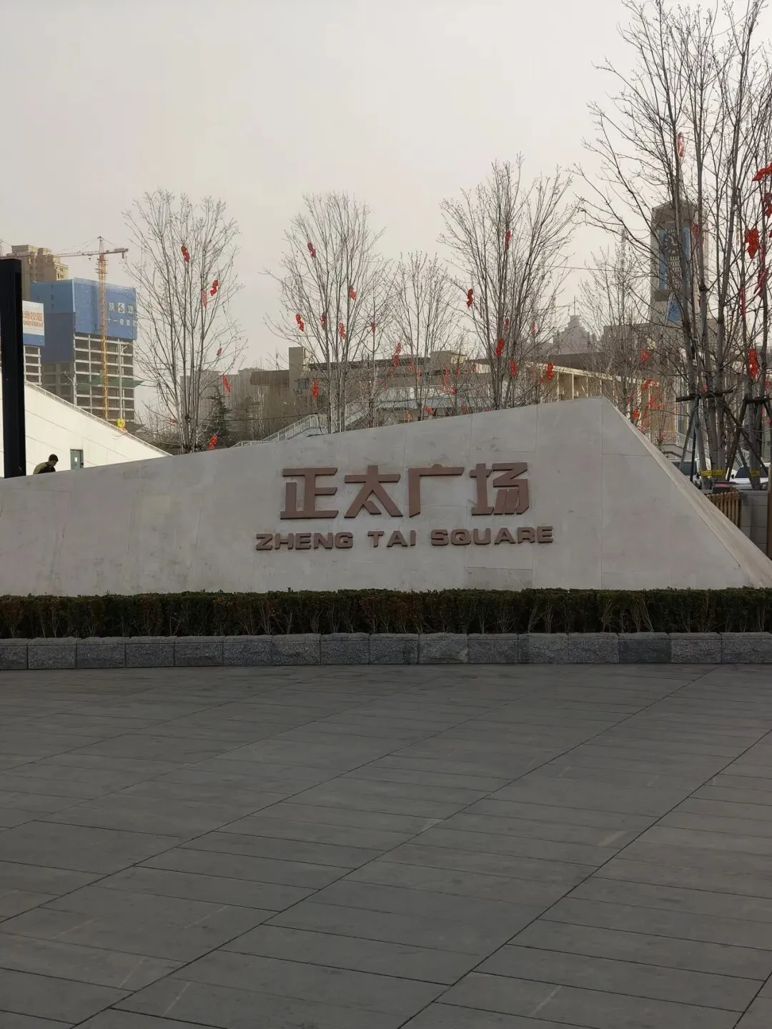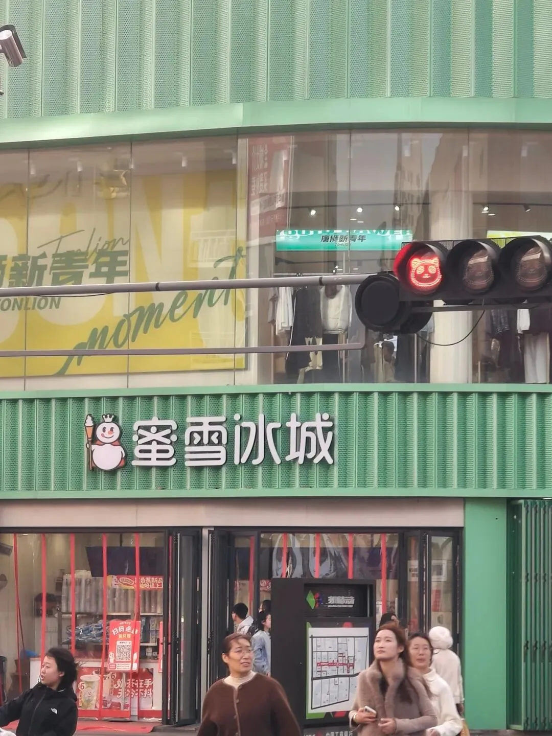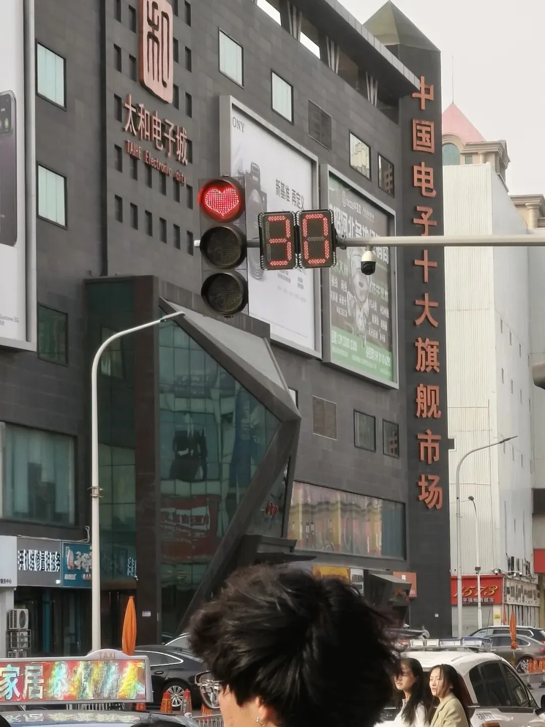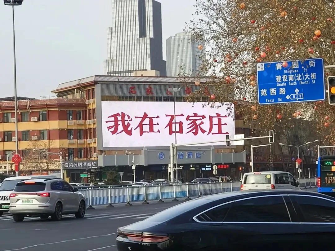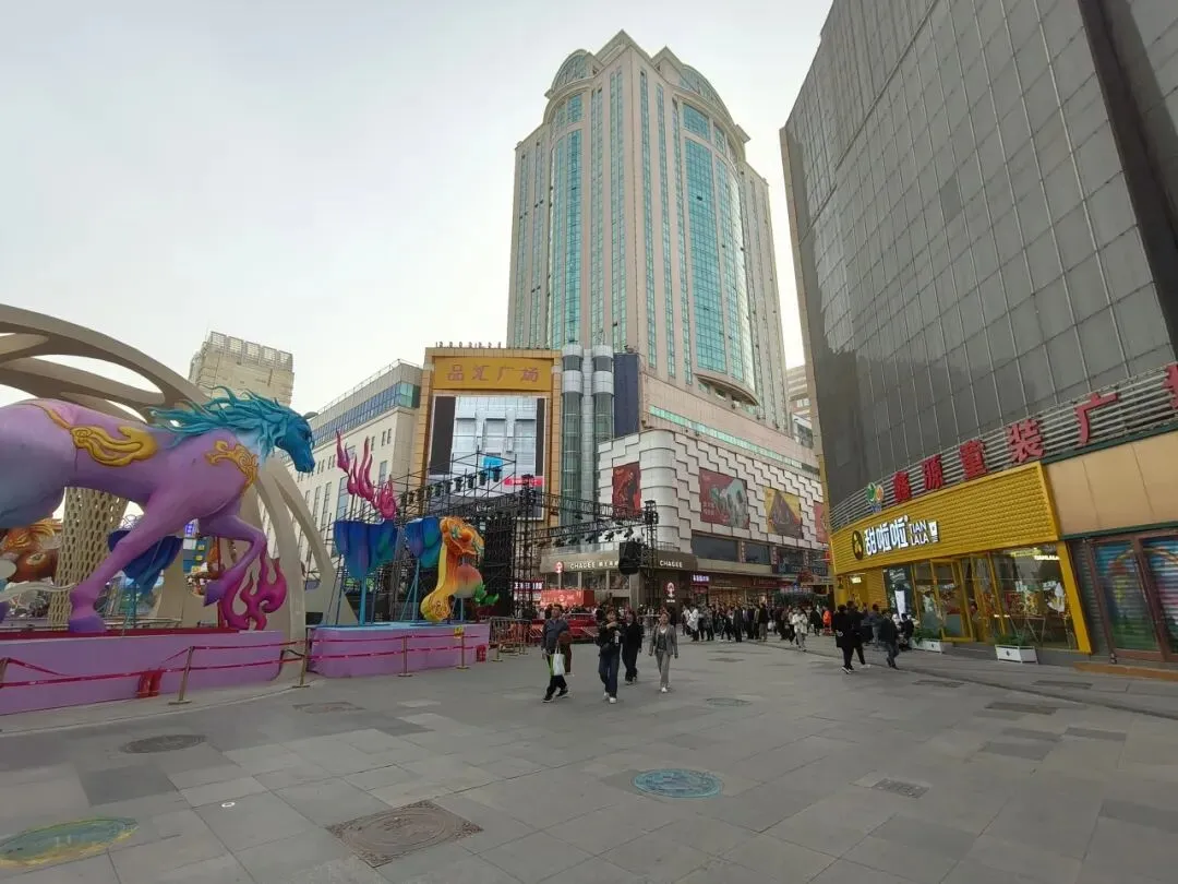 因为出来之后风和沙尘暴还是很大,我们不想再走到地铁口了,所以直接打了个车到解放广场。正太广场和石家庄的步行街也都在这里。这个步行街很长,占了两个地铁站之间的距离。路上的红绿灯也很有特色,灯是熊猫头和心形的。街边还有一个商场叫“华强广场”,也可以假装自己到了深圳。