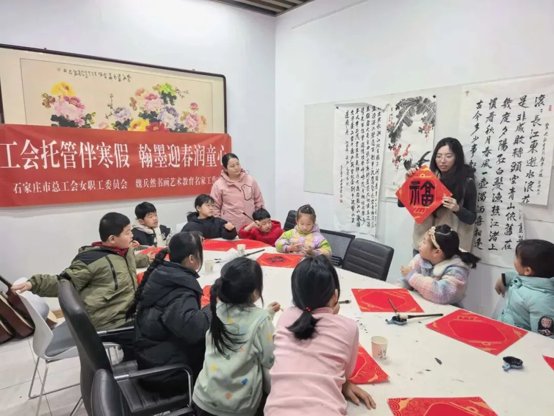 此次寒假托管班以“安全守护+特色拓展+素质提升”为核心模式,兼顾趣味性与成长性,让孩子玩中学、学中乐。石家庄市总工会女职工委员会为托管班量身打造写春联、剪福字等特色民俗课程,邀请专业书法老师现场教学,让孩子们在笔墨间感受年俗魅力、体悟传统文化底蕴;同时,托管班还开设了安全知识、思政教育、非遗体验等丰富课程,全方位提升孩子的综合素养。针对不同职工群体需求,各托管点还推出个性化服务,市二院工会为医护职工子女定制托管营养餐食,优化服务细节,全方位筑牢安全防线,让医护人员能安心坚守医疗一线;新华区总工会更是为孩子们送上书包、文具等爱心礼包,把温暖实实在在送到职工和孩子的心坎上。