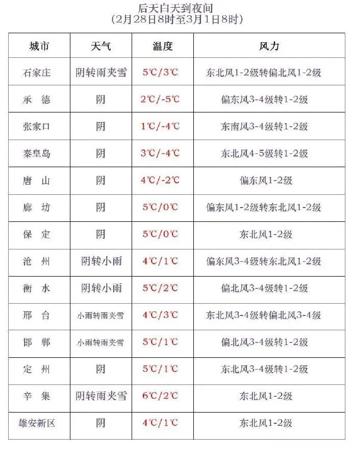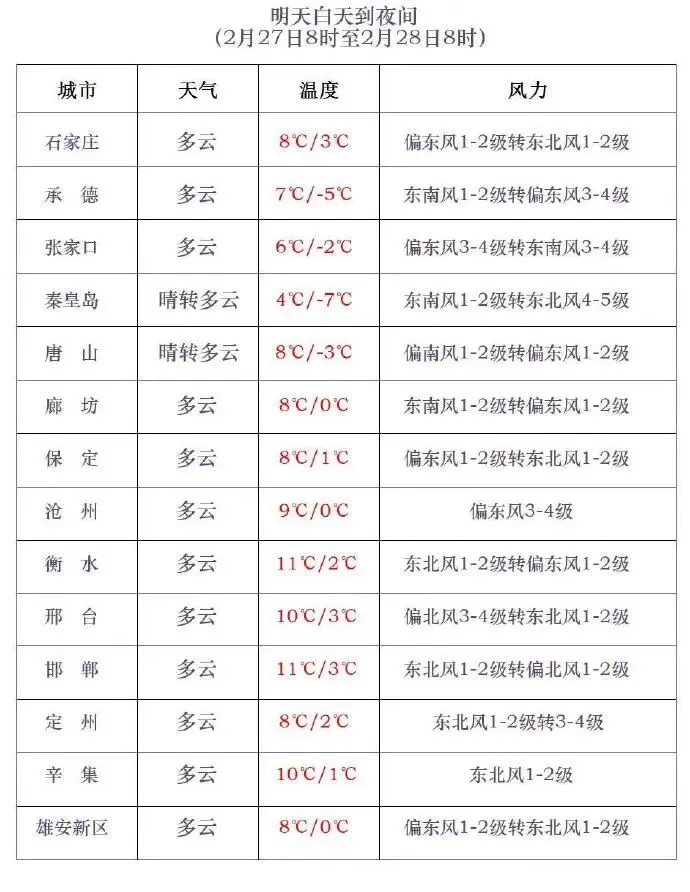 河北省气象台2026年02月26日11时发布天气预报:今天下午到夜间,保定、廊坊以北地区多云转阴有小雪,石家庄、邢台、邯郸三个地区的西部阴有小雨或雨夹雪,其他地区多云。最高气温,张家口北部、承德北部、唐山南部、秦皇岛东部-2~4℃,其他地区5~11℃。最低气温,张家口北部、承德北部-14~-8℃,其他地区-7~4℃。明天白天,石家庄、沧州及以南地区多云,其他地区多云间晴。明天夜间到28日,全省多云转阴,其中张家口、承德中北部、保定西北部有小雪或零星小雪,石家庄、衡水、邢台、邯郸有小雨。28日夜间到3月1日,石家庄、沧州及以南地区阴有小雨或雨夹雪,其中西部山区有小雪或雨夹雪;其他地区阴转多云。今天下午到夜间,渤海海域和沿海地区有东北风5到6级,阵风7到8级。27日夜间到28日白天,张家口北部、承德北部有偏南风5到6级,阵风7到8级;渤海海域和沿海地区有东北风5到6级,阵风7到8级。石家庄市气象台2月26日06时发布全市未来24小时天气预报:今天白天:阴有小雨,西部山区雨夹雪 风向风速:东北风3—4级 最高气温:7℃今天夜间:阴转多云,西部零星雨夹雪转多云 风向风速:东北风1—2级 最低气温:2℃ 关心天气更关心你